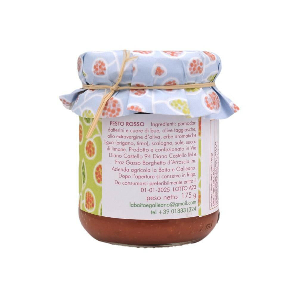 Das rote Pesto der Firma La Baita ist eine Spezialität aus Datterini-Tomaten und Rinderherzen, Taggiasca-Oliven, nativem Olivenöl extra, aromatischen Kräutern wie Oregano und Thymian, Schalotten, Salz und Zitronensaft.